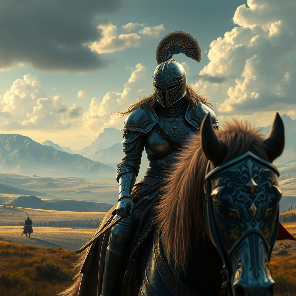 A noble knight traversing a vast medieval landscape with enchanting fantasy elements, digital art showcasing intricate and highly detailed designs, depicting a lone figure in full, gleaming armor. The setting exudes a rich RPG essence with cinematic lighting that enhances the medieval ambiance. The knight is a determined woman of strong bearing, accompanied by an equally armored and majestic horse. Her helmet is exquisitely crafted, and her presence is both fierce and graceful. The scene captures the essence of her journey with a hint of mystery and magic, avoiding any visual anomalies like duplicated or malformed features, ensuring a seamless, high-resolution masterpiece with no artifacts.