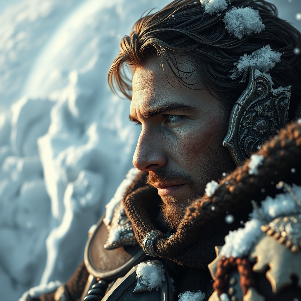 A noble male knight rests gracefully in a tranquil snowy landscape, inspired by Sturm from Dragonlance. His honorable presence is highlighted by the detailed craftsmanship in his face and eyes, capturing a masterpiece in 8k photorealistic quality. The scene feels alive with the artistic influences of Jeremy Mann, Sandra Chevrier, and Maciej Kuciara, achieving a sharp, realistic portrayal with real shadows and lifelike 3D effects. This depiction maintains a focus on artistic refinement and avoids elements like low resolution, unrealistic anatomy, childlike features, nude or NSFW content, cartoonish style, and excessive fantastical elements.
