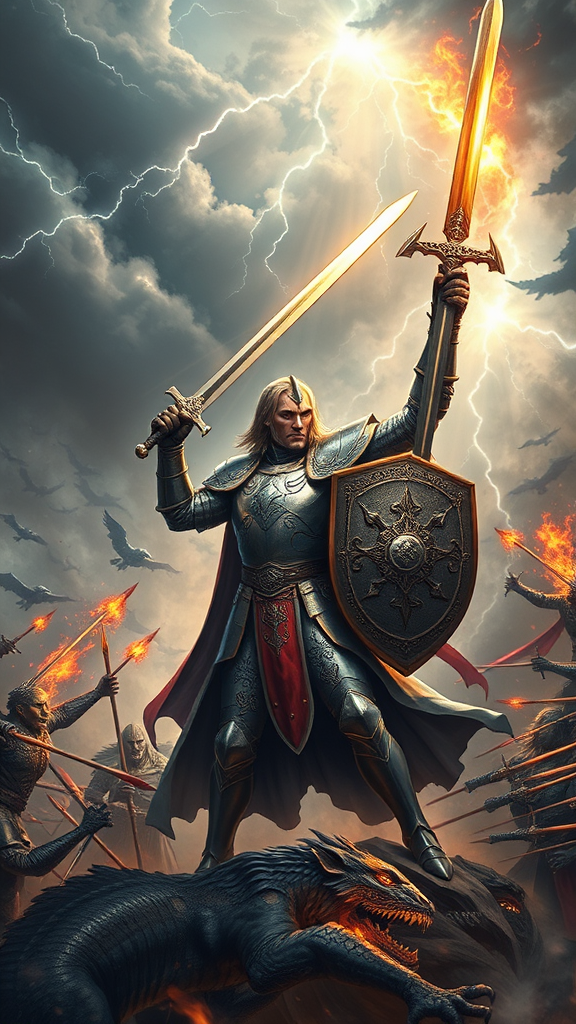 A noble paladin clad in intricately detailed armor stands valiantly amidst a swirling battle, the glint of polished steel catching the light as he raises a radiant longsword that seems infused with divine energy. His shield, emblazoned with ancient runes, deflects a barrage of fiery arrows. Around him, the ground trembles under the clash of mythical beasts and warriors. The scene is alive with dynamic motion, each stroke of his weapon a testament to his unwavering resolve. The backdrop is a tumultuous sky, swirling with storm clouds and flashes of lightning, casting an ethereal glow over the battlefield in a breathtaking display of fantasy art.