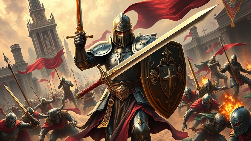 A noble paladin in intricately detailed armor stands at the forefront, their gleaming plate mail adorned with celestial motifs and bearing the marks of countless battles. They wield a radiant longsword, its blade shimmering with holy light, and a sturdy shield emblazoned with heraldic emblems. In the midst of a dynamic action scene, the paladin charges forward with determination, leading allies against a horde of menacing foes. Behind them, banners swirl in the wind, and the air crackles with the energy of magic and clashes of steel. The surrounding landscape is an epic fantasy battleground, filled with towering, ancient ruins and mystical creatures embroiled in combat, all illustrated in rich, vivid colors and dramatic chiaroscuro, capturing the valor and intensity of the moment.