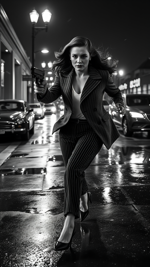 A noir-inspired film scene captures a 1940s detective woman skillfully dodging gunshots in high-contrast, black and white. Her beautiful face, framed by shiny long hair and subtle freckles, remains composed amidst the chaos. As bullets whiz by, they shatter nearby glass, casting chaotic reflections on the wet pavement beneath her quick-moving feet. Dust particles dance in the misty air, illuminated by dramatic rim lighting from street lamps. Her pinstripe trousers and tweed jacket billow slightly as she maneuvers with agility and elegance. The scene is set against the backdrop of a dimly lit street, where modern cars stand in stark contrast to the vintage atmosphere. The composition highlights her dark, reflective eyes and artfully applied makeup, enhancing her mysterious allure. The shallow focus and detailed lighting create a captivating depth of field, drawing attention to finely woven textures and the gleaming cityscape. The ambiance is further enriched by subtle fog, lending an air of suspense to the action.