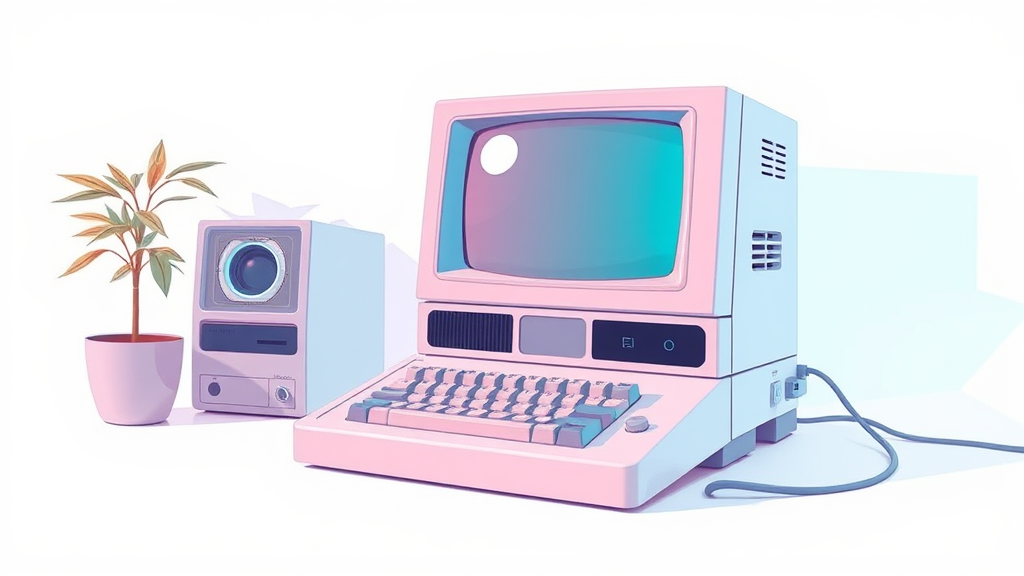 A nostalgic illustration of a classic retro computer, infused with a vaporwave aesthetic, reminiscent of Jim Steranko's style, featuring dreamy pastel tones of light pink and baby blue, showcased on a clean white backdrop, adding subtle hints of cyberpunk elements for a modern twist.