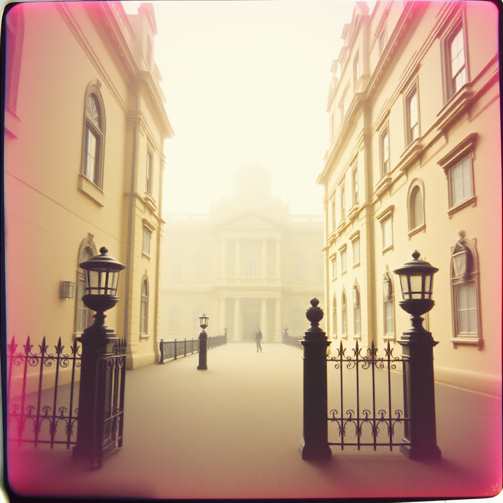 A nostalgic snapshot capturing the ethereal aura of a UK palace; the image features soft, muted tones and gentle, dreamy lighting as if seen through a vintage disposable camera, evoking a sense of faded grandeur and timeless beauty.