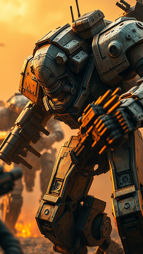 A nousr robot engaged in battle against a heavily armed adversary, intricately detailed, an artistic masterpiece with a palette of golden hues, inspired by the epic scale and aesthetic of Warhammer 40,000, featuring high dynamic range and realism. The scene is cinematic, with warm, dramatic lighting illuminating the hyper-detailed robots, set against a complex, evocative background, capturing the monumentality and intensity of their confrontation.