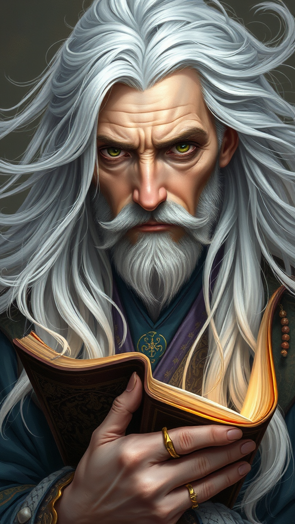A painted portrait of an enigmatic magic man with flowing silver-white hair, a mature and serene presence. His eyes, detailed and kind, reflect a world of wisdom and wonder. Adorned in traditional mystical attire, he cradles an ancient tome, exuding an aura of enchantment. The artwork is a fusion of fantasy and elegance, capturing the intricate, multidimensional essence of a gentle spirit. Rendered in digital painting, the concept art achieves smooth, sharp focus, offering a rich and vivid illustration.