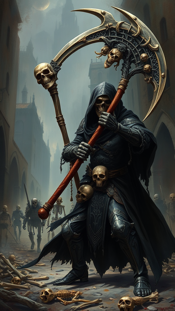 A painting captures a dark fantasy scene in the style of a grim reaper battling in full plate armor. He wields an enormous scythe crafted from bones and adorned with skulls, embodying the grim essence of gritty dark fantasy. The backdrop is an ancient, forsaken city shrouded in shadows, its streets littered with bones and wandering skeletons. The reaper wears a black hooded cloak trimmed with intricate gold patterns, his ominous visage obscured by a haunting skull mask. The dim light casts stark contrasts, accentuating the foreboding atmosphere of this chilling confrontation.