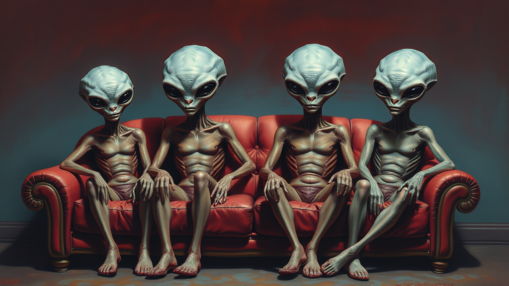 A painting depicts four extraterrestrial beings seated on a couch, rendered in a trompe-l'œil style with meticulous illusionistic detail and a lifelike presentation of their forms. The scene is bathed in rich shades of dark crimson and light blue, reminiscent of the aesthetic found in American prints from 1880 to 1950, creating an otherworldly yet familiar atmosphere.