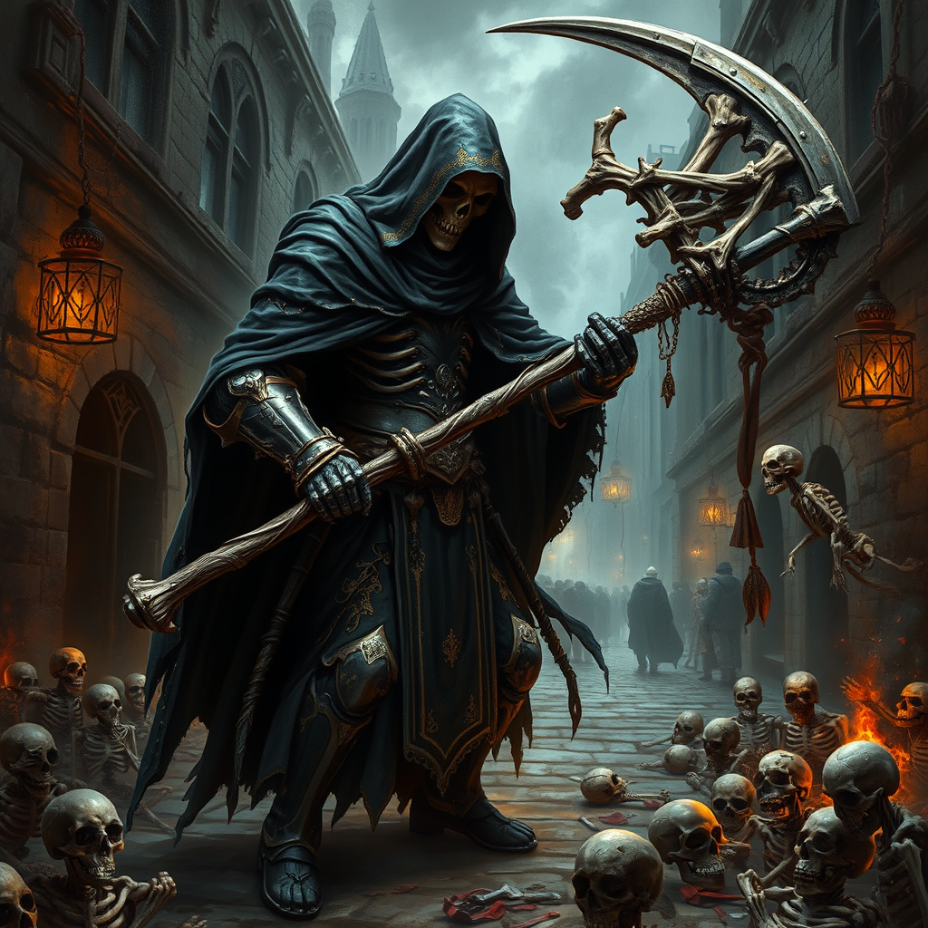 A painting in the style of a dark fantasy artist depicting the grim reaper clad in intricate full plate armor, fiercely wielding an oversized scythe crafted from intertwining bones and skulls. The scene is set in an ancient, foreboding city alive with an eerie ambiance, where countless bones and animated skeletons litter the cobblestone streets. The reaper dons a tattered black hooded cloak with luxurious gold embroidery, his haunting presence amplified by a fearsome skull mask. The somber, gritty setting enhances the sense of chaos as shadowy tendrils weave through the atmosphere, adding to the surreal and nightmarish quality.