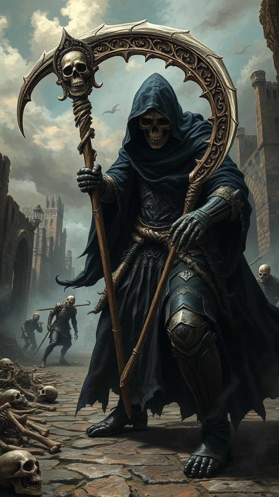 A painting in the style of a dark fantasy artist depicts the grim reaper clashing in full plate armor, wielding a colossal scythe crafted from interwoven bones and skulls. The scene unfolds in a gritty dark fantasy setting, inside an ancient city shrouded in shadows and filled with remnants of bones and restless skeletons. The reaper is adorned in a flowing black hooded cloak with intricate gold embellishments, concealing his visage behind a menacing skull mask. Sparse, ghostly wisps hover around the scene, adding an ethereal, otherworldly aura as ominous clouds swirl above, accentuating the dire atmosphere. The city’s crumbling architecture looms in the background, hinting at a past civilization now forsaken, while the cobblestone streets bear witness to the relentless battle.
