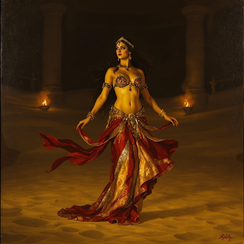 A painting in the style of Michelangelo captures a mesmerizing scene viewed from afar, slightly angled to reveal a majestic woman poised elegantly at the edge of a tranquil sand dance arena. Her entire figure, from her delicate, arching feet to the crown of her head, is bathed in the soft, golden glow of torchlight, which illuminates the entire space. Her slender, graceful frame is defined by a chiseled stomach and decorated in resplendent belly dancing attire of rich red, shining gold, and shimmering silver. The garments are lavishly embroidered with intricate patterns and adorned with deep wine-colored gems and delicate chains. She wears ornate thigh bands, upper arm bracelets, and intricate ornamentation in her hair and across her forehead. Warm hues of red, gold, and silver play upon her sun-kissed skin. Her raven hair, cascading to her waist like silken waterfalls, frames her striking bright blue eyes that cut through the dimness. Around her neck is a mysterious black iron band with a gold D-ring, hinting at hidden stories. The flickering torchlight accentuates the textures of her attire and the medieval backdrop. Her inviting gaze, filled with quiet assurance and a touch of vulnerability, beckons the viewer into a world of enchantment and mystique, where beauty and wonder swirl together. The scene unfolds from a distance, capturing the enchanting dancer in her entirety, poised to mesmerize as the music begins.
