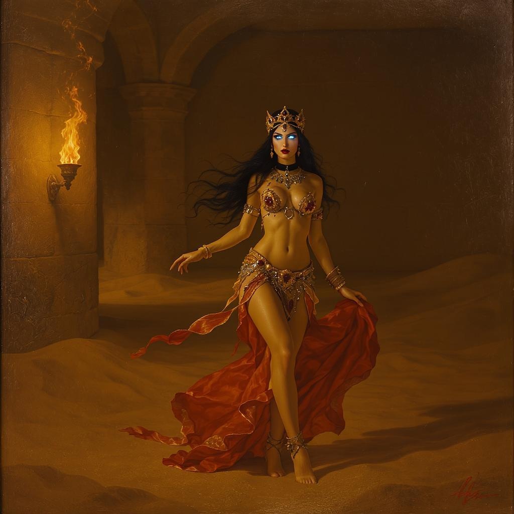 A painting inspired by Michelangelo captures a wide-angle view of an enchanting scene, with the distant figure of a lone, majestic woman standing poised in a serene sand dance pit. Bathed in the warm glow of golden torchlight, she awaits the music's start with confident grace. Her slender form is highlighted by a sculpted midriff, adorned in exquisite dance attire of radiant red, gold, and silver hues. The attire is embellished with intricate gold embroidery and deep wine-colored gemstones and chains. Her ensemble includes thigh bands, upper arm bracelets, and elaborate headpieces. Her raven-black hair cascades like velvet down her back, framing bright blue eyes that shimmer in the flickering torchlight. A mysterious black iron band encircles her neck, featuring a gold D-ring, hinting at untold secrets. The medieval room's torchlight highlights the textures of her skin and attire. Her sultry gaze captures the viewer's attention, exuding quiet confidence while battling the shadows of timidity. Her presence invites the viewer into an enchanting world of beauty and mystique, her radiant allure complemented by the medieval ambiance.