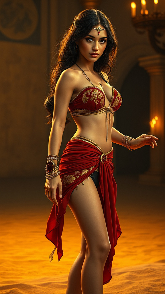 A painting inspired by the style of Michelangelo captures a wide, angled shot from in front and to the side, presenting a lone, majestic woman poised in anticipation in a tranquil sand-strewn dance arena, illuminated by the warm, golden glow of torchlight. Her slender form reveals a sculpted midriff, adorned in exquisite dancing attire of rich red, gold, and silver, embellished with intricate golden embroidery, deep wine-colored jewel adornments, and delicate chains. Her ensemble is completed with thigh bands, upper arm bracelets, and elegant hair and forehead ornaments. The interplay of red, gold, and silver hues enhances her sun-kissed skin. Her cascading raven hair falls in waist-length waves like velvet waterfalls, framing her striking, bright blue eyes that shine through the dimness. Around her neck, a black iron band with a gold D-ring introduces an element of mystery. The torchlight casts a radiant glow over the medieval room, accentuating the textures of her attire and surroundings. Her alluring gaze captivates the viewer, exuding a quiet confidence mingled with traces of vulnerability. This composition invites the beholder into a spellbinding realm of beauty and wonder, maintaining a distant, yet enchanting perspective.