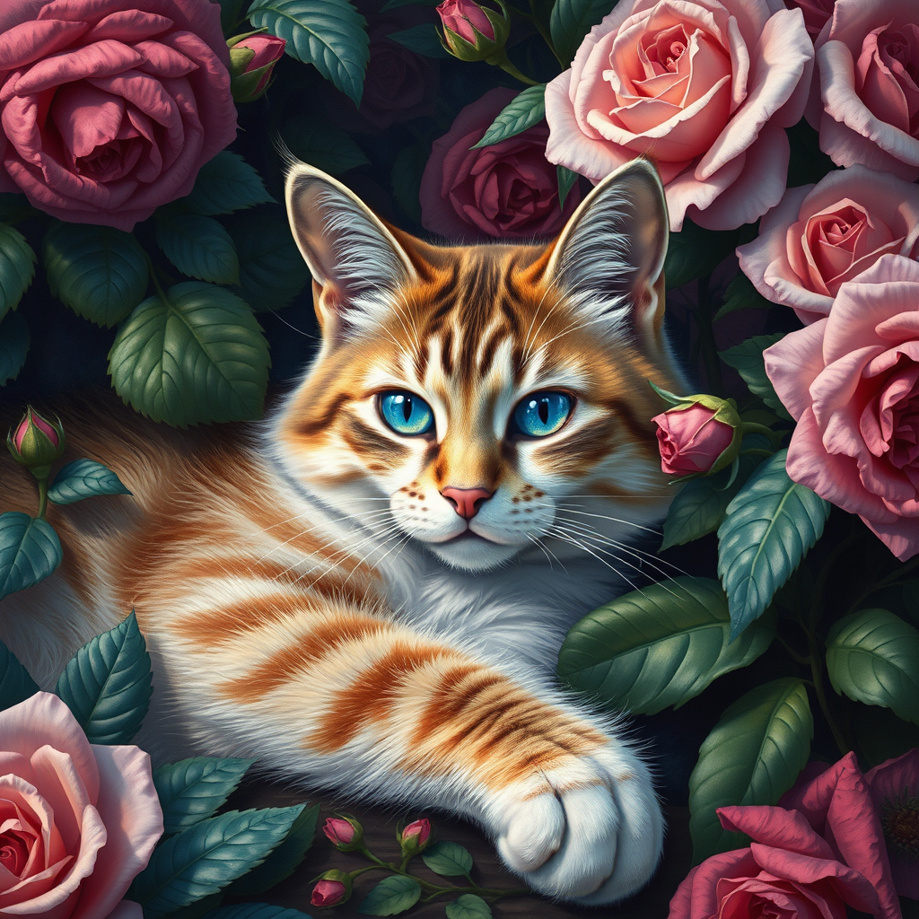 A painting of a cat with sapphire eyes lounging in a rose garden, intricately detailed with influences from Kerembeyit, Hieronymus Bosch, and Dan Mumford. This highly detailed 4K digital artwork captures the essence of a serene feline amidst a lush floral landscape, blending surreal elements with vibrant colors and fine textures. The scene is rich in depth, showcasing a meticulous interplay of light and shadow, bringing the cat and roses to life in a fantastical, almost dreamlike setting.