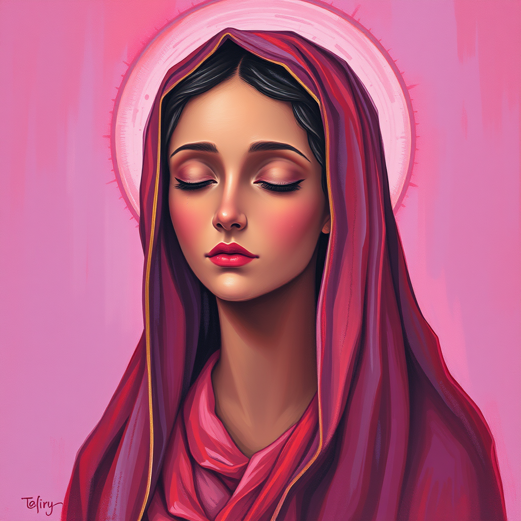 A painting of a figure reminiscent of Mary, featuring a color palette dominated by light red and purple hues. The artwork's style takes inspiration from tarot cards, with finely detailed facial features. Incorporating the essence of Haifa Zangana's creativity and the cultural richness of Tongan art, the piece displays a meticulous attention to realistic detail. The work channels a sense of spirituality, similar to Ann Stookey's influence, and features an elongated, elegant composition.