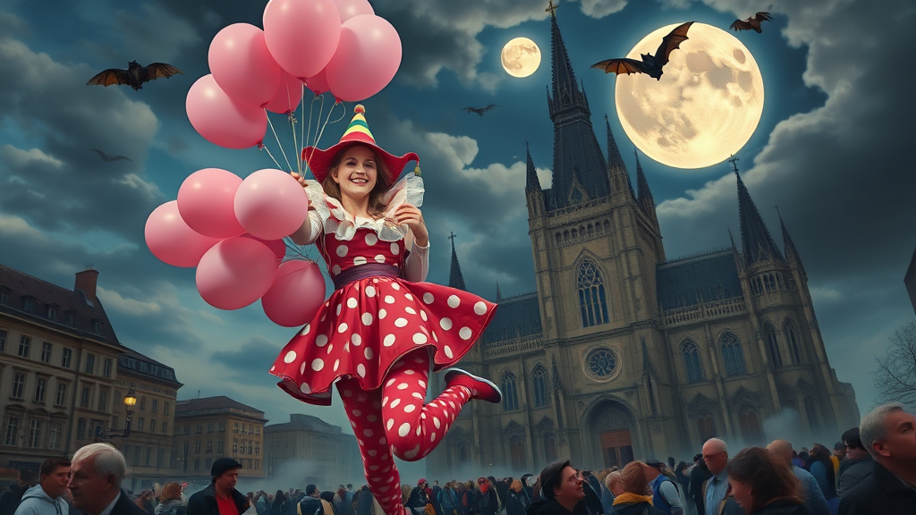 A painting of a full-body depiction of a joyful woman dressed as a whimsical flying clown with a kind smile in a crowded city atmosphere. She holds a bunch of pink balloons, wearing vibrant polka-dot leggings. The scene is set against a grand cathedral with an ominous yet enchanting sky featuring a full moon. Bats can be seen flying in the partially clouded midnight sky. Volumetric fog adds a mystical touch, enhancing the hyper-realism of this scene. Inspired by the style of Albert Bierstadt, this oil painting captures a blend of charm and mystery.