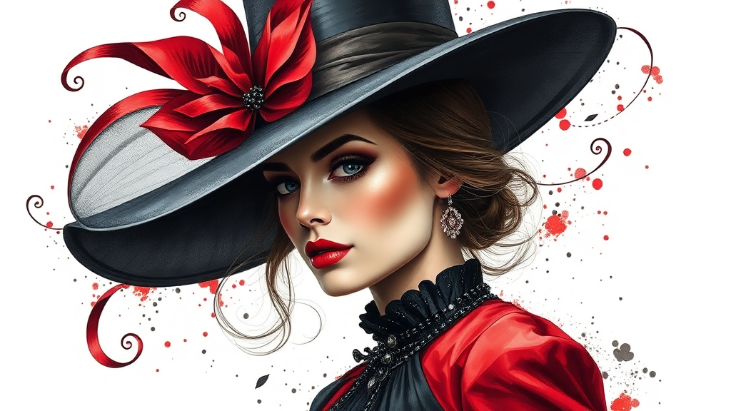 A painting of a graceful woman wearing an elegant black hat, crafted in the style of color splash with dark silver and rich red accents. She embodies a steampunk essence, with swirling figura serpentinata lines that create a dynamic pose. Her attire blends striking white and deep red, with handsome features that evoke a sense of mystery and allure. The contrasting values stand out vividly against a pure white background, creating an arresting visual masterpiece that balances sophistication and intrigue.