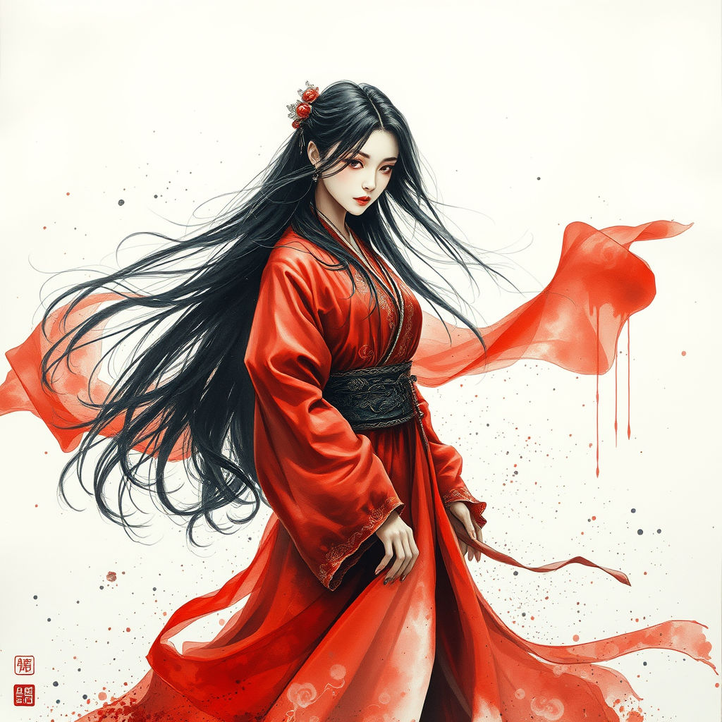 A painting of a mysterious woman in a flowing red gown with long, black hair cascading softly around her shoulders. The scene is rendered in delicate ink washes, evoking a sense of timeless, epic fantasy set in an ethereal landscape. The style is reminiscent of traditional Chinese painting, with splattered and dripped ink adding a dynamic and organic texture. The woman is adorned in an exquisitely detailed traditional costume, with intricate patterns subtly emerging from the soft focus background, which is predominantly a pristine white. Light and shadows play across the canvas, enhancing the fantasy atmosphere and giving depth to her enigmatic expression.