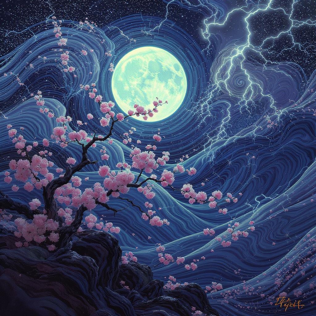 A painting of a plum blossom framed by the luminescent moon, inspired by George Lacom and James A. R. Izzy, merging elements of Night Moonlight and Moonlight Night, where plum blossoms intertwine with lunar glow, reminiscent of Marin's Calm Night. A digital illustration capturing the ethereal moonlight of an autumn night, drawing upon Ji Sheng and Shen Shichong, weaving a luminous style painting with a dreamy and blurry essence. The calm night is depicted with influence from Amédée Ozenfant, creating a fantastic vision in the astral cosmic plane, with surreal and ethereal hues and surreal dreamscape. Light and shadow play across an undulating landscape, layered with fractal thunder reminiscent of Dan Mumford's style and Alex Gray's psychedelic surrealism. The scene is a vista of waves and ripples, forming an optical illusion of psychedelic art, inspired by Cyril Rolando. The artwork captures an infinite psychedelic wave structure, authentic and rippled, encapsulated in a psychedelic illustration and rendered in OC renderer - V6, with slight creative twists while maintaining its core dreamy and mystical essence.