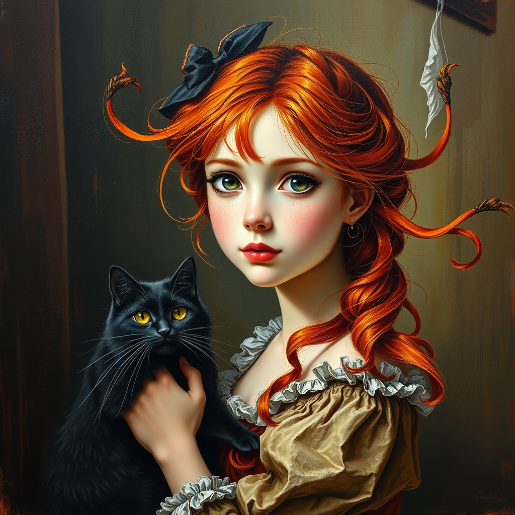 A painting of a redheaded girl with a vibrant personality, accompanied by her enigmatic black cat, set against a backdrop of bold colors and thick brushstrokes that capture the essence of their surroundings. Swirling lines convey the girl's spirited nature, while the scene is depicted in the style of Vermeer with intricate details of 1600s dress and the play of dark, dramatic lighting. Artistic modifications subtly enhance the core concept, bringing the location and characters to life.