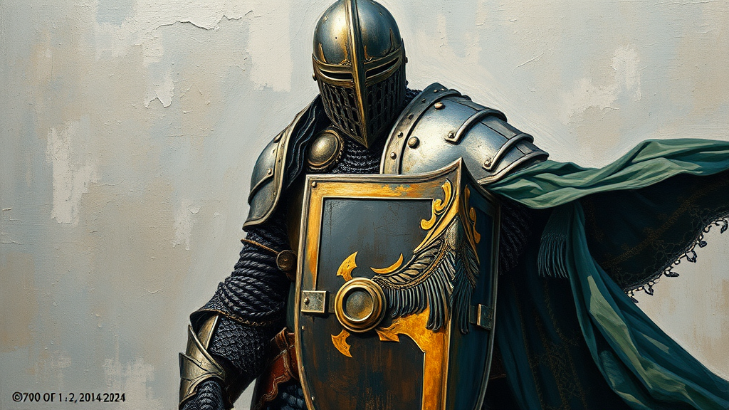 A painting of a stoic knight clad in intricately detailed armor, a shield glinting with dark white and bronze hues, and a flowing cloak billowing behind, crafted with influences from adventure pulp novels and Yup'ik art motifs. The surface is textured with the bold strokes of palette knives, creating a dynamic mottled effect. Highlights of light indigo and green accent the composition, blending the traditional with a modern touch. The style captures an era of 1970 to the present, infusing a sense of historical depth and contemporary flair—an expansive portrait with a 1:2 aspect ratio, its high stylization adding a surreal, artistic edge.