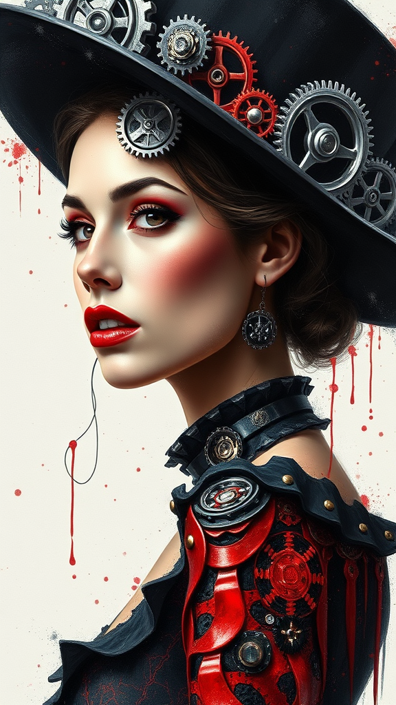 A painting of a woman in a black hat adorned with intricate gears and cogs, embodying a steampunk aesthetic. Her posture is dynamic and fluid, akin to figura serpentinata, and she exudes an aura of elegance. The color palette features a striking splash of dark silver and deep crimson red, creating dramatic contrasts against a white background. Her features are handsome and sharply defined, with an interplay of light and shadow enhancing the depth of the composition. Flecks of white and red highlight her attire, adding to the visual intrigue.