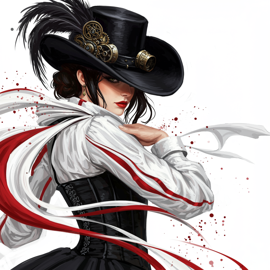 A painting of a woman in a striking black hat adorned with intricate steampunk elements, crafted in a color splash style with dark silver and vibrant red accents. Her pose captures the elegance of figura serpentinata, enveloped in gracefully swirling white and red fabrics. The composition plays with handsome contrasting values set against a pristine white background, emphasizing her strong yet graceful presence.