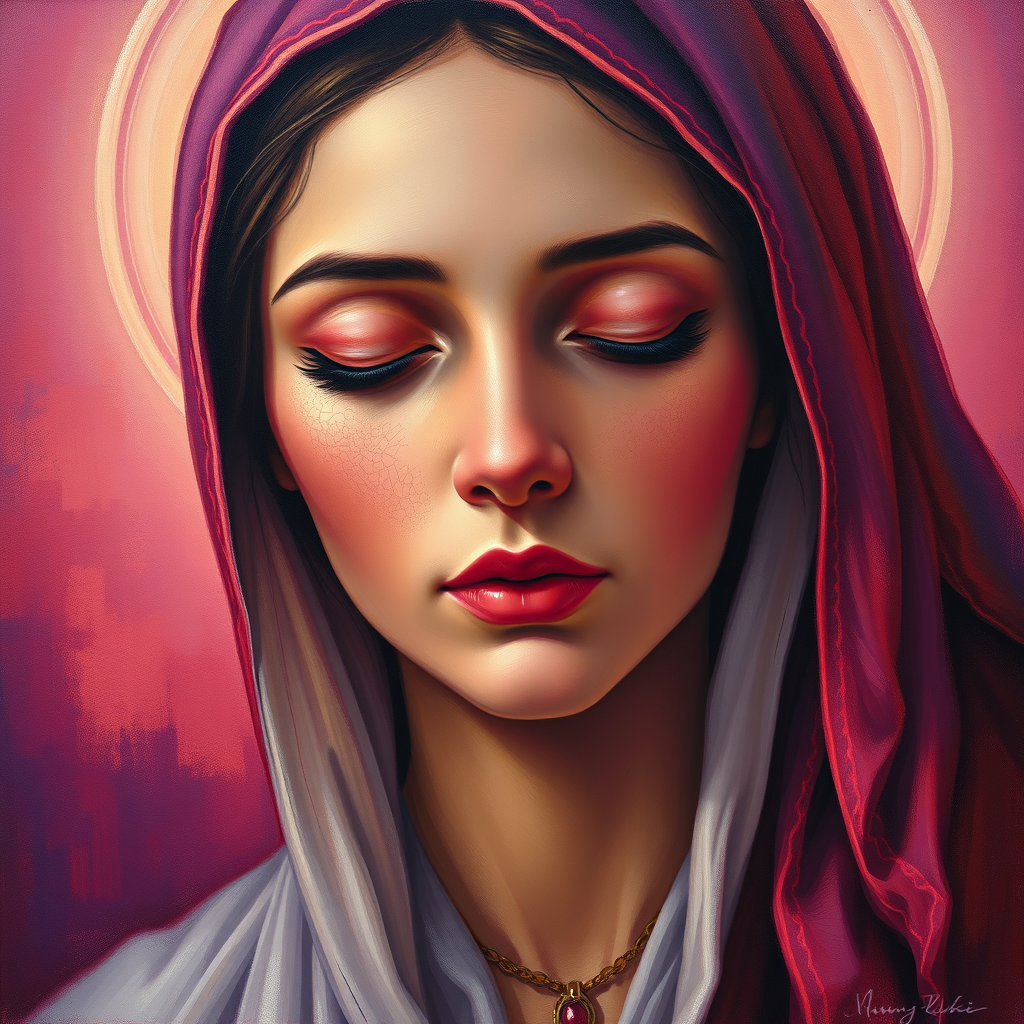 A painting of Mary in light red and purple hues, capturing detailed facial features, blending the ethereal style of tarot cards with the intricate artistry of Haifa Zangana. Infuse elements of Tongan art, focusing on realistic attention to detail, reminiscent of Ann Stookey's style, with a portrait aspect ratio of 105:128 and a serene atmosphere.