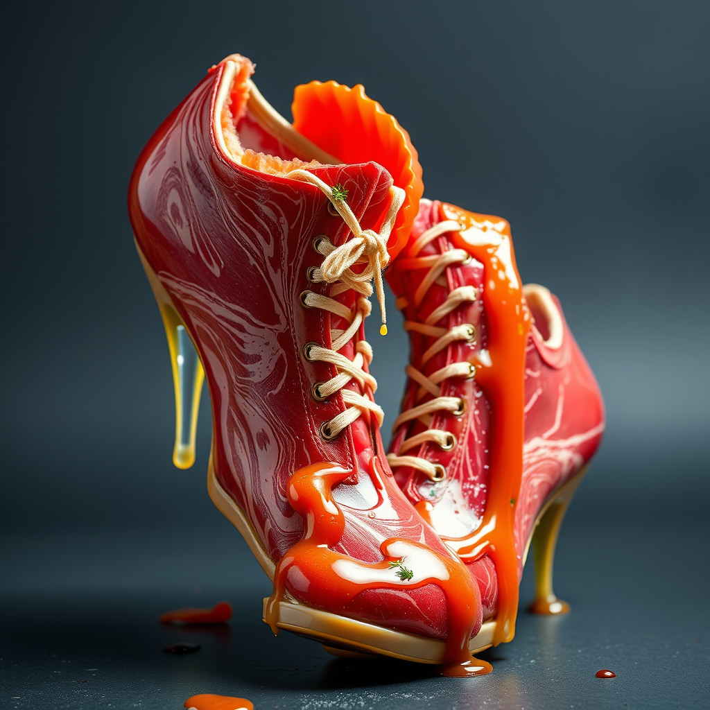 A pair of avant-garde shoes crafted entirely from vivid, surreal raw meat, showcasing splashy and artistic food photography techniques, with added accents of glistening herbs and glossy sauces for a pop of color.