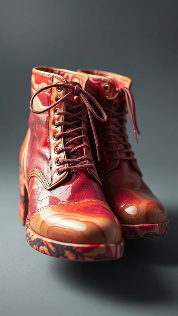 A pair of avant-garde shoes crafted from a blend of surreal and raw meat textures, showcasing vibrant, splashy colors reminiscent of high-end food product photography, with subtle twists like glossy marbling and intricate, delicate sinew patterns.