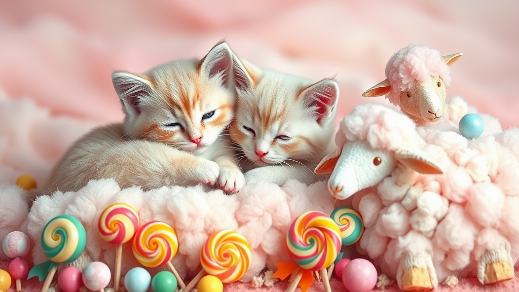 A pair of fluffy kittens nestled together, captured in pastel hues reminiscent of Christen Kobke's delicate artistry, their fur soft like clouds in a dream. Surrounding them, a whimsical rococo landscape unfolds, with rainbow-hued sheep that resemble cotton candy, their wool crafted from an array of colorful candies and lollipops, creating a magical, confectionery world.