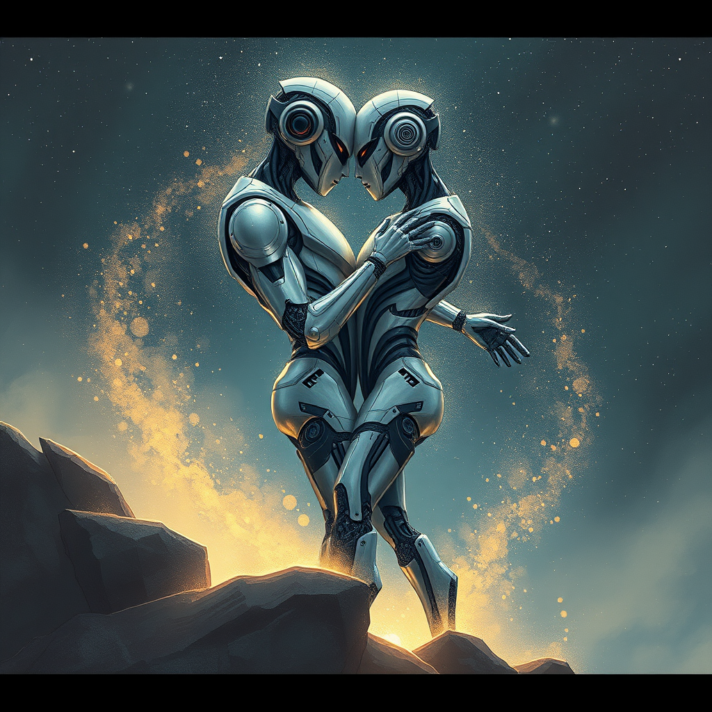 A pair of futuristic cyborgs locked in an intimate embrace on the precipice of the cosmos, enveloped by an ethereal mist of stardust, their forms echoing perfect symmetry and the elegance of the golden ratio, rendered in a dynamic fusion of concept and sketch artstyle, their metallic features reflecting the distant glow of galaxies in a celestial dance.