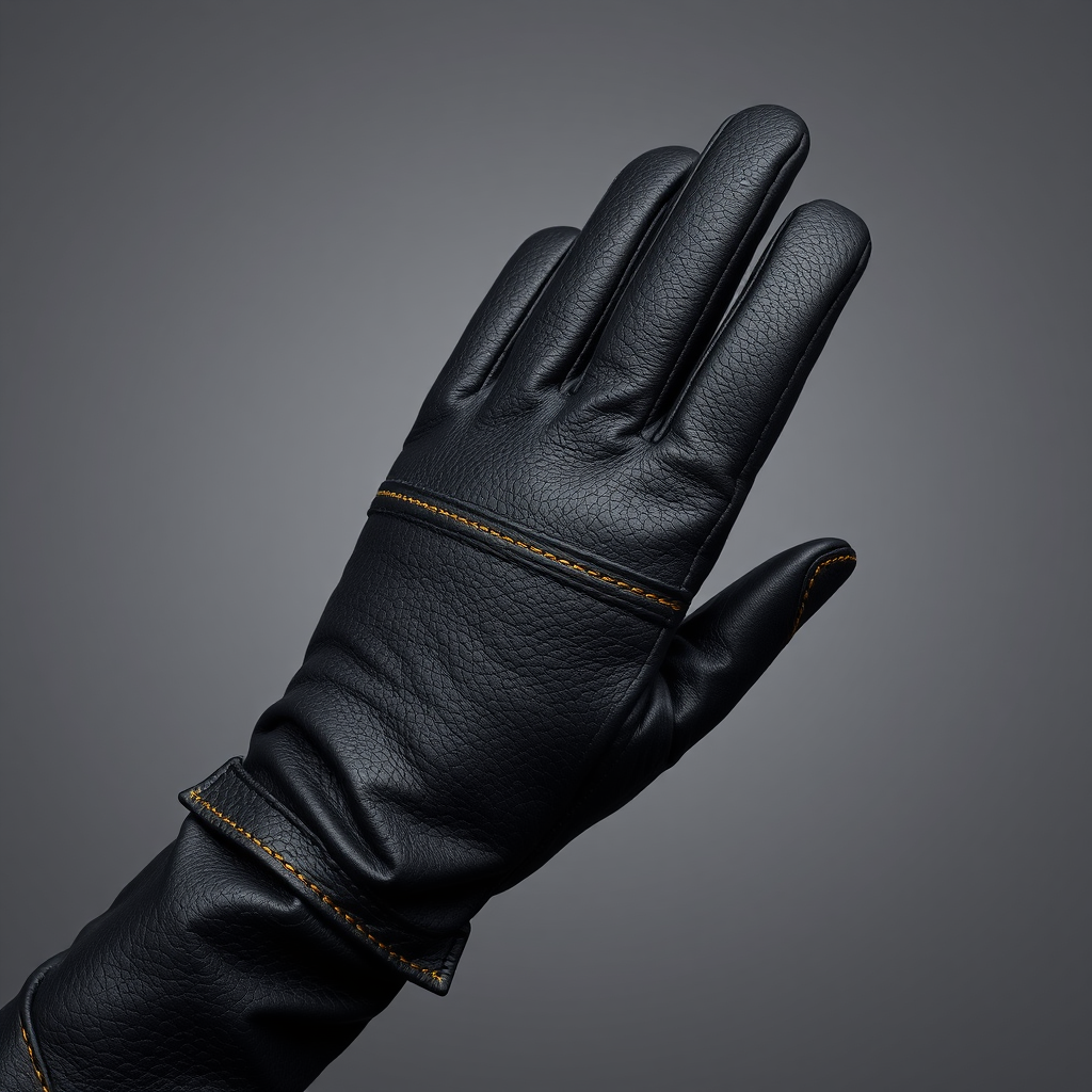 A pair of minimal gloves crafted from textured matte black leather in a rich dark grey shade, accented by a subtle yellow stitch point. The macro lens set at f/5.6 zooms in to reveal the intricate leather pattern and exquisite craftsmanship. The studio lighting is skillfully adjusted to cast defining shadows that highlight the details against a smooth grey background.
