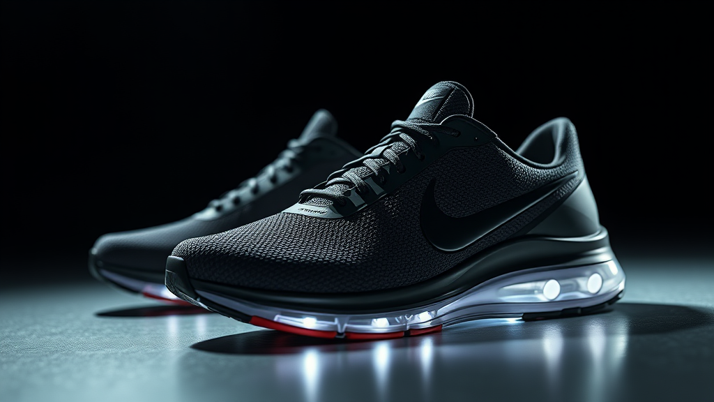 A pair of Nike pace shoes crafted from advanced rubber and composite fibers, showcasing a sleek black Nike logo. Captured in stunning detail with the artistic touch of Steven Meisel, the scene is illuminated with exquisite soft lighting that enhances the shoe's design. Rendered using Unreal Engine and Octane, the image boasts high definition quality with an impressive IQ of 180, set in a dynamic 2:3 aspect ratio. The photograph captures the essence of speed and innovation, highlighting the shoe's modern aesthetics while bathed in a subtle yet captivating indirect glow.