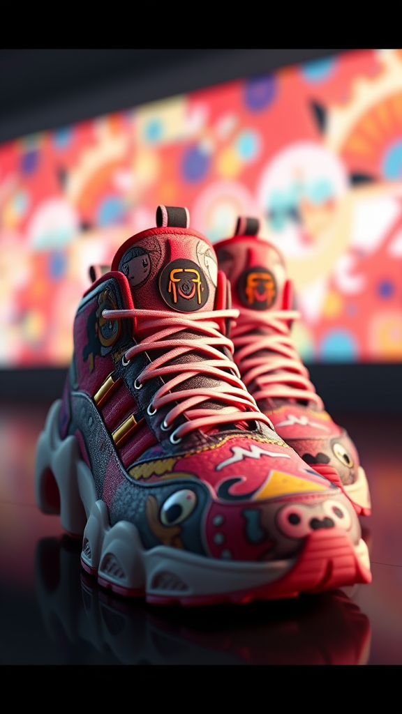 A pair of sneakers designed with inspiration from Takashi Murakami, showcasing high intricate detail and texture, rendered in 3D with advanced techniques. Featuring vivid cinematic lighting achieved in Unreal Engine and Octane Render, the sneakers boast vibrant colors and unique artistic elements characteristic of Murakami’s style in 8k resolution, crafted with superior precision and subtle creative twists.