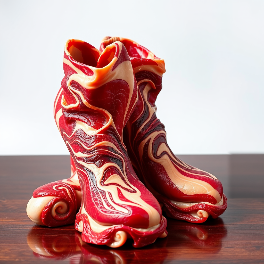A pair of surreal, avant-garde shoes crafted entirely from vibrant, artfully arranged raw meat, resembling an opulent display of abstract food photography, with intricate marbling and rich, bold colors that evoke a sense of fluid motion and unexpected beauty.