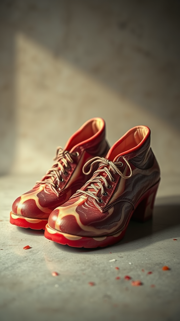 A pair of surreal shoes crafted from raw meat, depicted with vivid, splashy food product photography; the shoes exude a bizarre yet captivating allure, where the marbled textures of the meat intertwine with hints of glistening sinews, creating an avant-garde fashion statement that balances on the edge of reality and imagination, the sheen of the meat contrasting against the soft, ambient lighting, adding an artistic depth that draws the viewer into the peculiar world of unconventional couture.