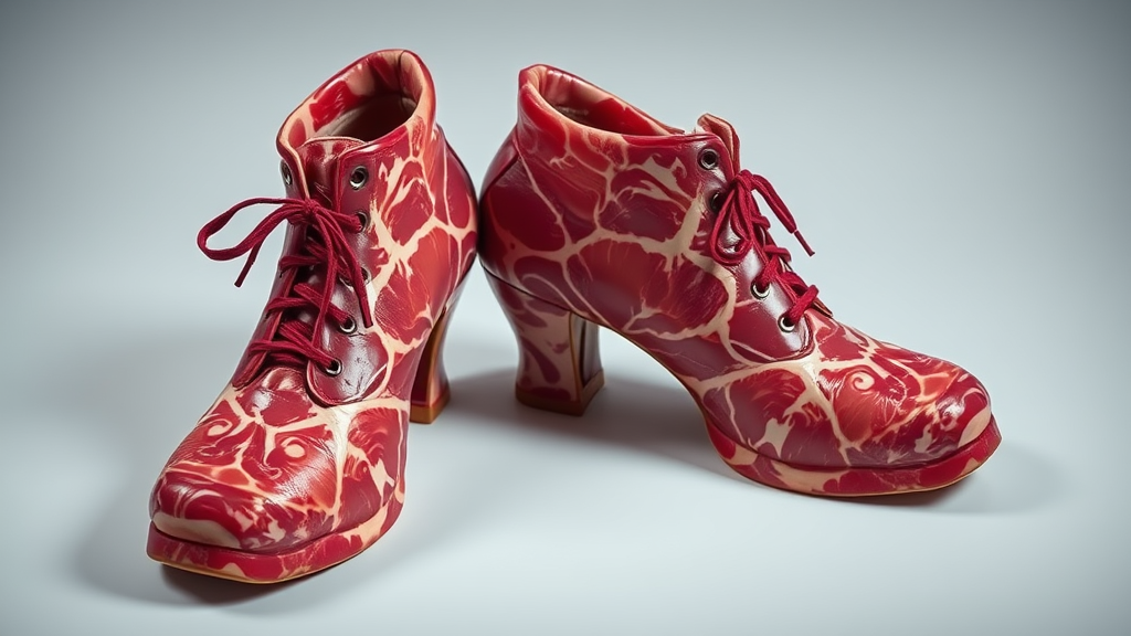 A pair of surreal, vibrant shoes crafted from raw, marbled meat, designed in a splashy style reminiscent of avant-garde food photography, with intricate patterns highlighting the texture and sheen of the meat, creating an imaginative fusion of fashion and culinary art.
