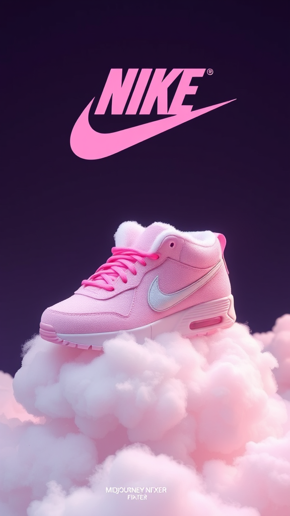 A pair of whimsical shoes crafted from cotton candy, designed in a 3D render, gracefully resting atop a fluffy cloud. The iconic Nike logo is subtly integrated into the design, creating a clean and enchanting composition. This beautiful artwork illustration embodies the playful essence of a dreamlike journey, brought to life with vibrant colors and soft textures, as if conjured by the artistry of Midjourney Nfixer.