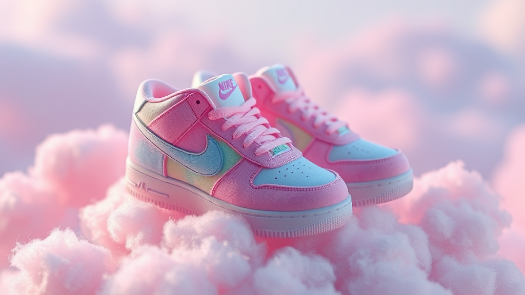 A pair of whimsical sneakers crafted from colorful cotton candy with an ethereal Nike logo, delicately balanced on a fluffy cloud, vibrant 3D render captures the dreamlike scene, elegant composition, a stunning artwork illustration, infused with the imaginative style of nfixer.
