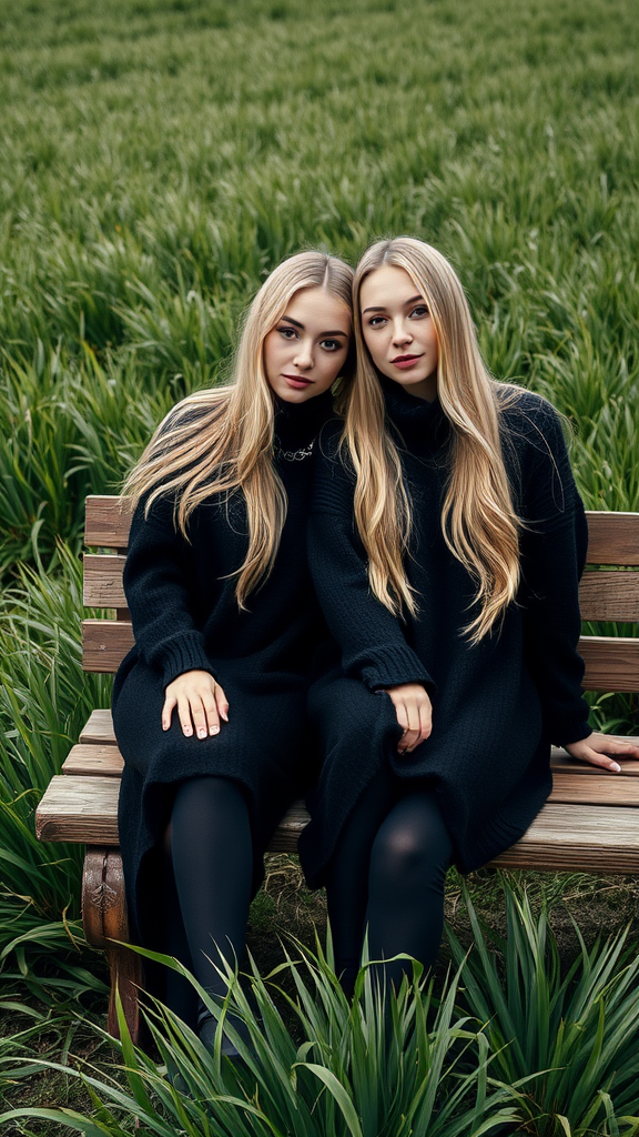 A pair of women are seated on a rustic wooden bench, drawing inspiration from the style of Ren Hang and the aesthetic of Tumblr. They are positioned gracefully in a wide, verdant field, the blades of grass swaying gently around them. Both are clad in cozy black wool sweaters, their long blond hair flowing over their shoulders, creating a striking contrast against the lush greenery. The scene captures a serene moment, with the soft light casting gentle shadows, highlighting their tranquil expressions and adding depth to the vibrant landscape.