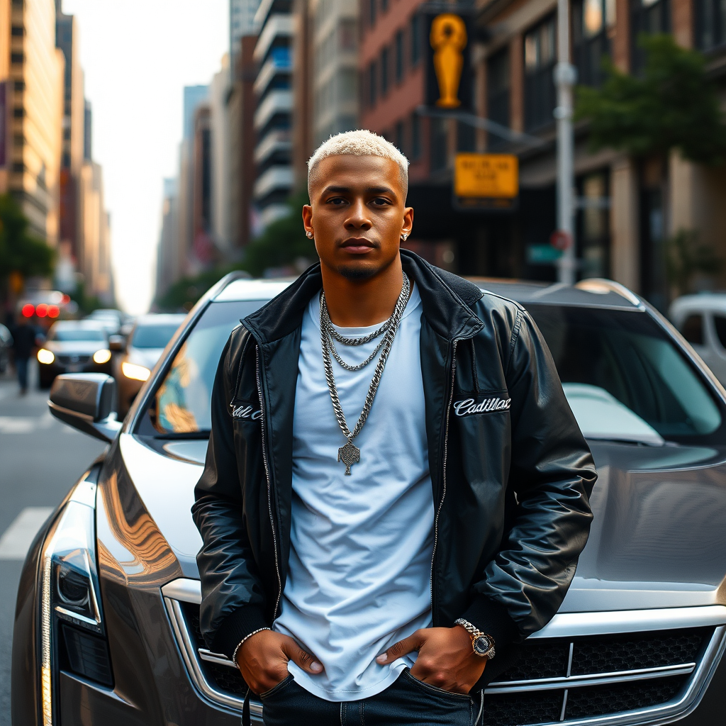 A pale-skinned shorthair rapper leans casually against a sleek Cadillac on a bustling city street, exuding confidence amidst the vivid urban landscape.