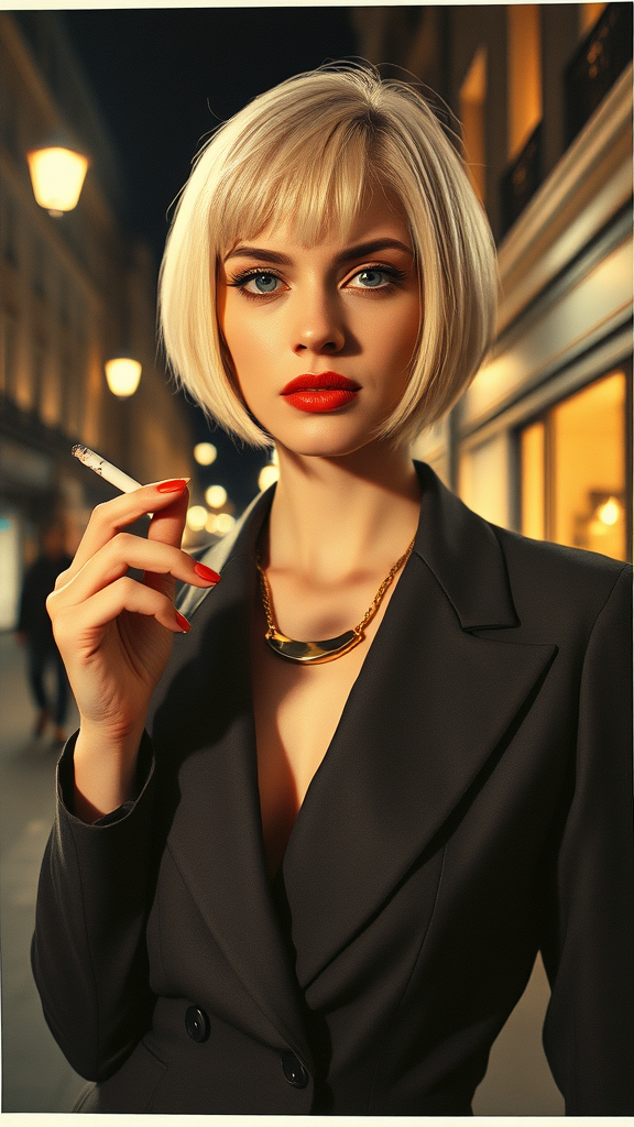 A pale-skinned woman with a sleek platinum blonde bob haircut, clad in a chic tailored suit and an elegant gold necklace, stands on a dimly lit Parisian street at night. She is poised, cigarette in hand, her gaze fixed intently on the camera. The scene is captured on Polaroid film with a bright front flash, casting stark shadows and giving a retro aura. The perspective is a low angle view, capturing the essence of raw street fashion with an urban backdrop.
