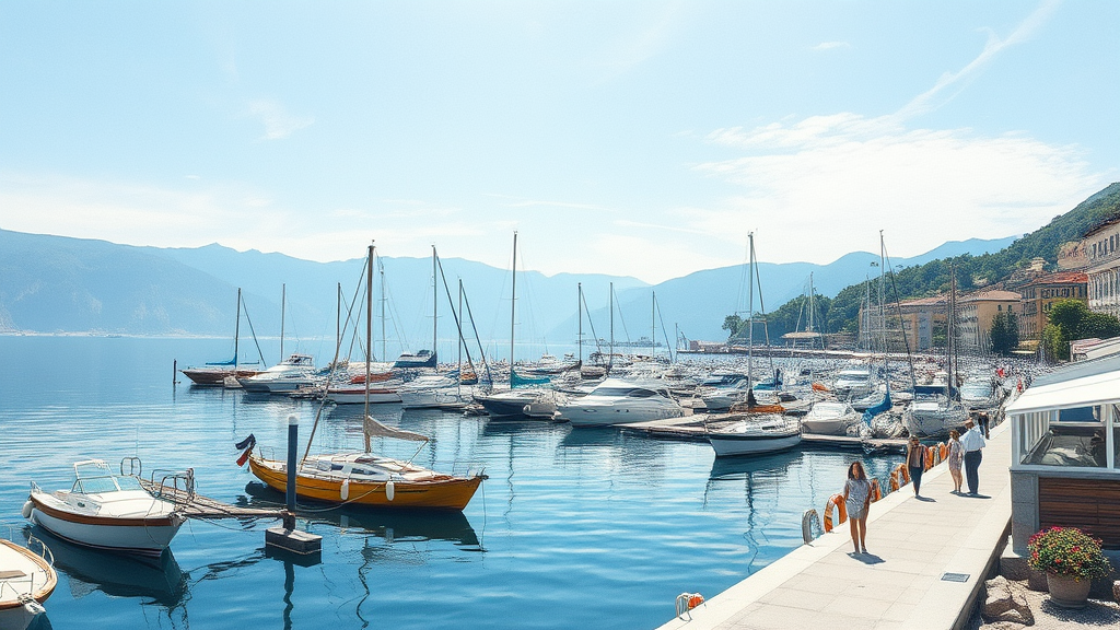 A panoramic perspective of Riva del Garda presents a serene Mediterranean Italian harbor scene captured with the essence of wet paper and watercolor vignette. The atmosphere is dreamy and infused with bright colors, where intricate details emerge softly under gentle lighting. The composition reflects the vision of a master artist, incorporating intentionally mundane graphics. Low resolution enhances the texture, juxtaposing sharp elements with overall low quality. Human figures populate the scene with charmingly imperfect anatomy, adding a whimsical touch.