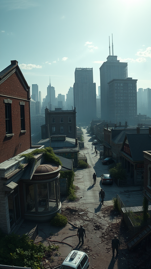 A panoramic view of a city overrun by a horde of zombies, showcasing a surreal blend of chaos and desolation. The focus is on the crumbling storefronts and abandoned houses, with towering buildings in the distance casting long shadows over the deserted streets. Echoes of Detroit's architecture are evident in the urban landscape. Rendered in Unreal Engine 5, the scene captures an ultrarealistic, 8K resolution, immersing the viewer in the eerie atmosphere of an apocalyptic scenario with haunting details that include shattered windows, overgrown vegetation reclaiming the concrete, and remnants of civilization fading into the horizon.