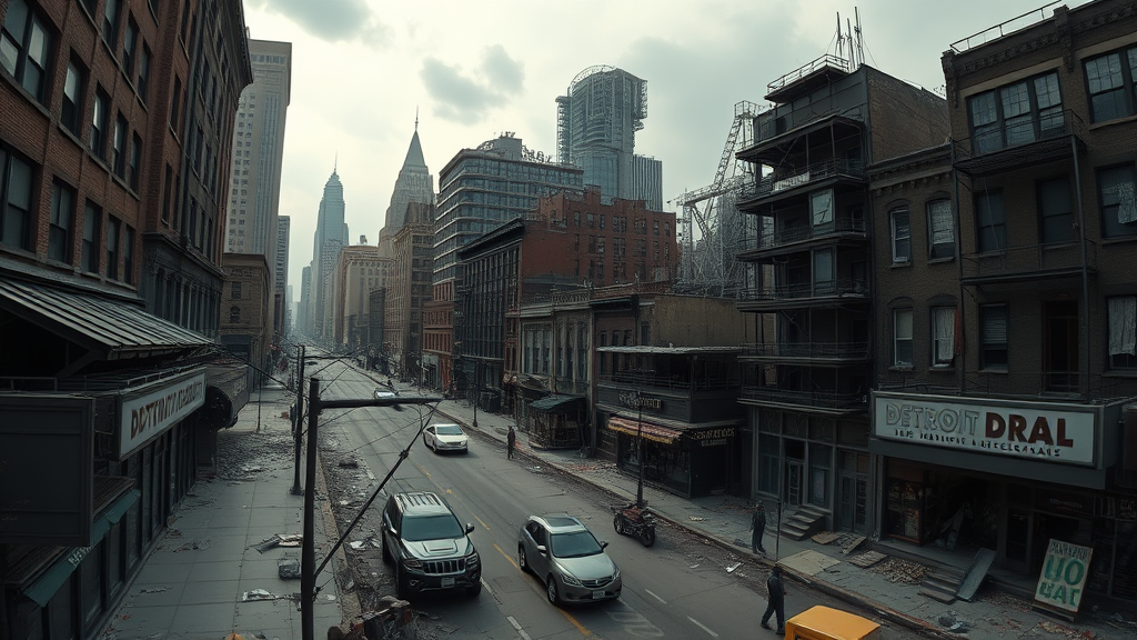 A panoramic view of a city ravaged by a relentless zombie apocalypse, showcasing deserted storefronts and dilapidated houses, towering buildings crumbling under the weight of chaos, a once-bustling Detroit now eerily silent, rendered in stunning Unreal 5 detail, hyper-realistic atmosphere, captivating 8k resolution, desolation and decay intertwined with haunting beauty.