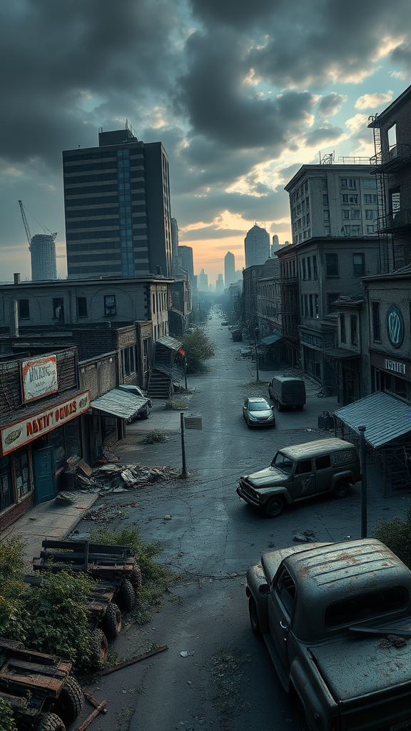 A panoramic view of a city ravaged by an unrelenting horde of zombies, with a focus on dilapidated stores, crumbling houses, and deteriorating buildings, set against the desolate backdrop of Detroit. Rendered in Unreal Engine 5, the scene is presented in an ultra-realistic, 8k resolution, capturing every haunting detail of the destruction. The once-bustling streets are eerily silent, with overgrown vegetation reclaiming the land, broken windows reflecting the fading sun, and abandoned vehicles rusting in place, telling silent stories of the lives once lived there. The atmosphere is thick with a sense of foreboding, as shadows stretch long and dark, enveloping the skeletal remains of a city in chaos.