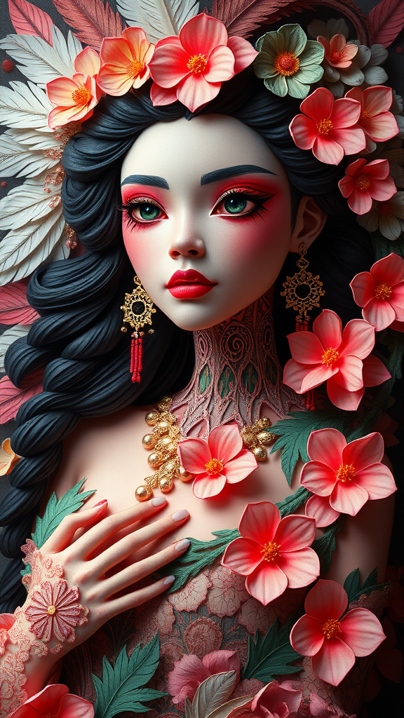 A paper craft style portrayal of a voluptuous concubine adorned with feathers and flowers, drawing inspiration from the intricate works of Ernst Haeckel and Maria Sibylla Merian. Infused with artistic elements reminiscent of Tristan Eaton, Victo Ngai, Artgerm, and Rhads, balanced with the dynamic essence of Ross Draws, Kaethe Butcher, and Hajime Sorayama. Greg Tocchini and Virgil Finlay's sci-fi influences bring a sense of wonder, while neon lights and vibrant colors enhance the digital painting style akin to Ilya Kuvshinov's work on Pixiv. Rendered in 8k, UHD, and HDR for breathtaking detail, this artwork explores themes of mutation and duplication with cross-eyed features, elongated neck, and extra fingers, adding an otherworldly feel. Retaining focus on artistic cohesion, the composition avoids distractions such as low resolution, out-of-frame elements, blurriness, or unintended artifacts, ensuring a clean presentation without watermarks, logos, or text intrusions.