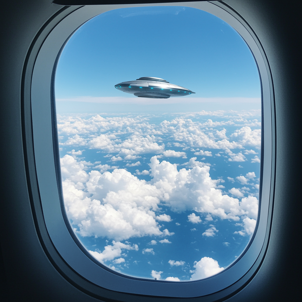 A passenger gazes through the oval window of a plane, where fluffy white clouds drift lazily across the brilliant blue sky; in the distance, a sleek, metallic UFO hovers mysteriously, its smooth surface reflecting the sunlight as it casts a shimmering shadow over the endless sea of clouds below.