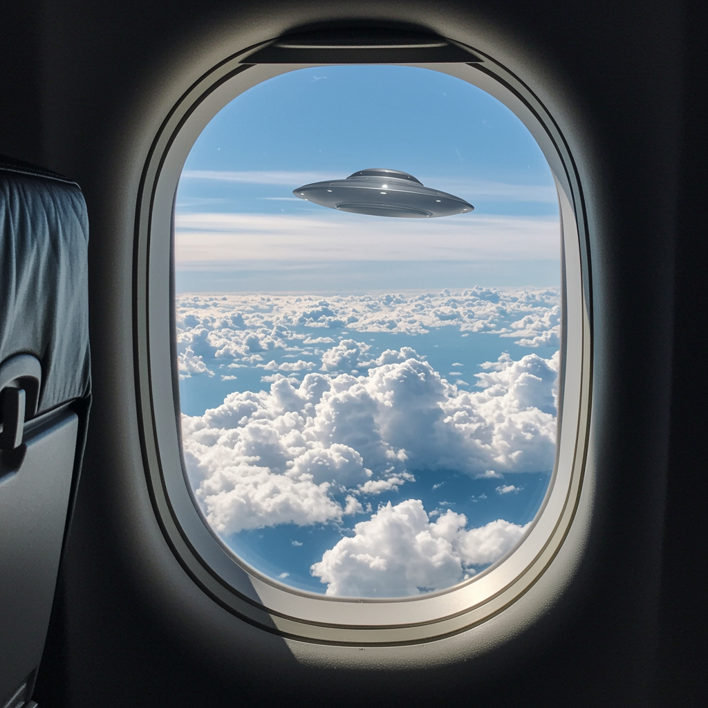 A passenger sits gazing through the oval plane window, eyes catching a vast expanse of fluffy white clouds drifting serenely by. Beyond this peaceful scene, a gleaming UFO hovers in the sky with an enigmatic presence, its metallic surface reflecting the sun's rays. The view is framed perfectly by the plane's interior, with the outlines of the seats serving as a gentle reminder of this surreal journey through the heavens.