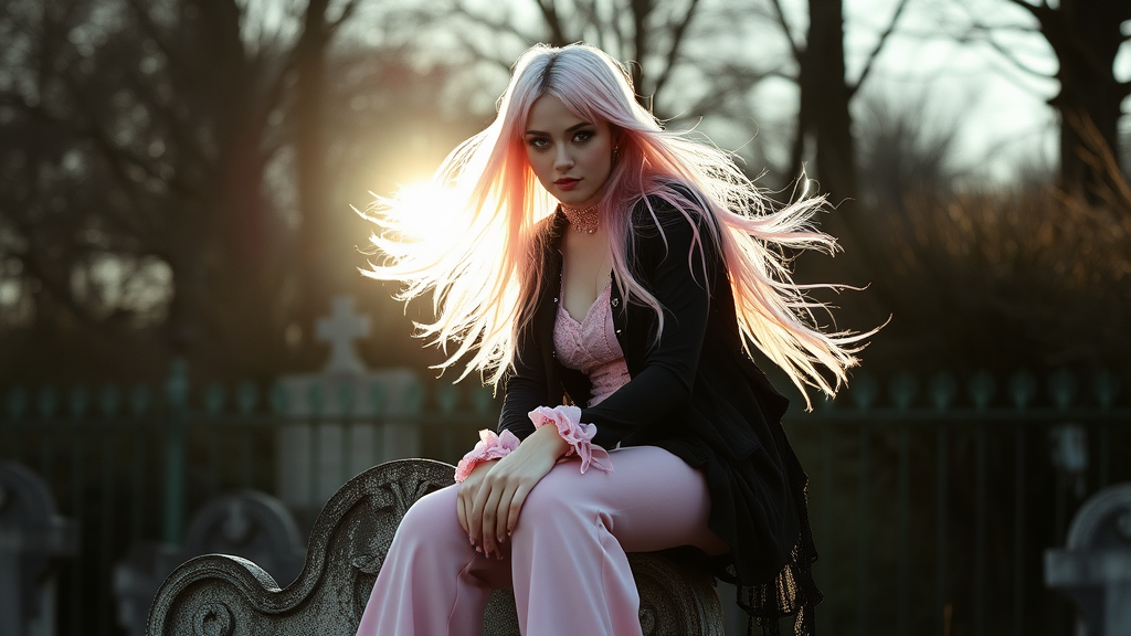 A pastel goth figure with a black metal influence sits atop a weathered tombstone, her ensemble awash in shades of pale pink. The intense sunlight hits her face from the side, casting dramatic shadows that highlight her makeup and emphasize her browless expression. Her flowing, dark attire contrasts with her pastel accessories, creating a striking visual. The scene is captured with the warm tones and grainy texture typical of Kodak Portra 800 film, with an elongated 9:16 aspect ratio that enhances the composition's moody, ethereal aesthetic.